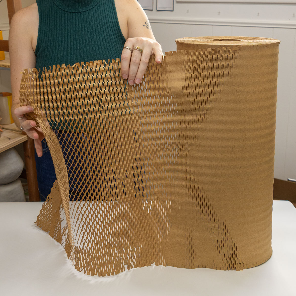 Pro Tip: Honeycomb wrapping paper from Packaging Supplies By Mail is available in large rolls and works with or without a dispenser. The paper expands as you stretch it, creating natural cushioning that keeps your ceramics secure and stable.